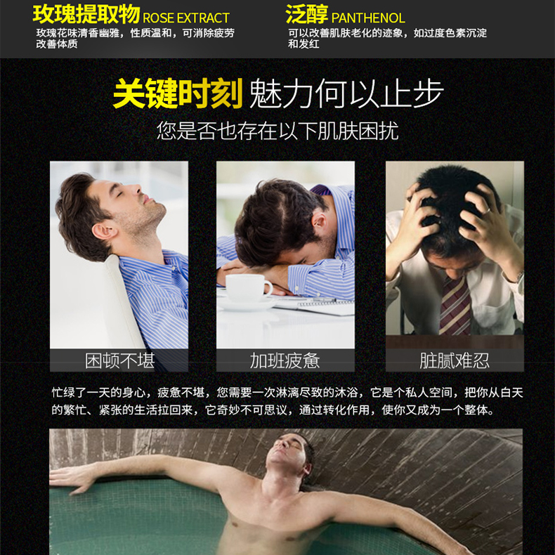 男士清爽沐浴露其主要成分有蘆薈提取物、檸檬酸、玫瑰提取物、泛醇。每一滴都是