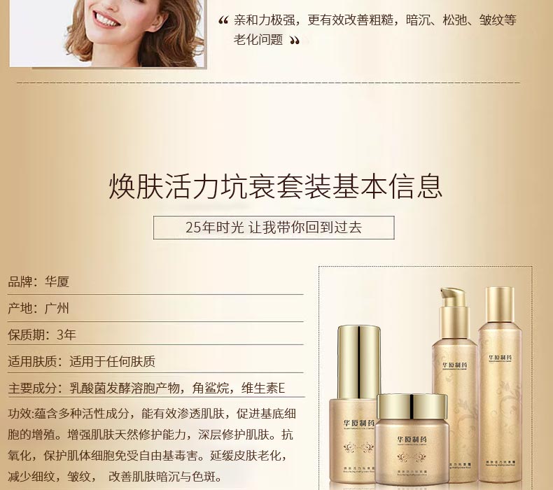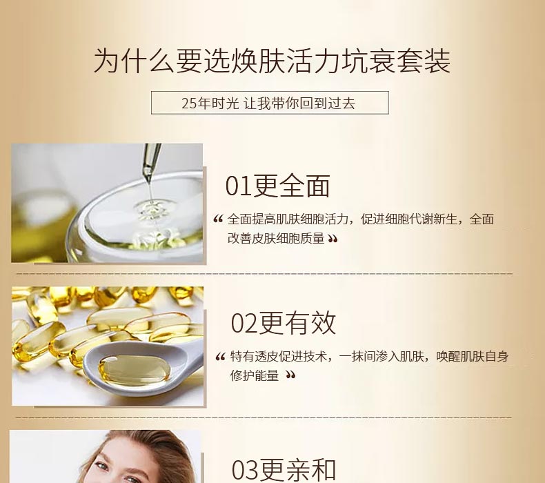 令萬千女性心儀的煥膚活力坑衰套裝,通過清除肌膚最深層的細(xì)胞分子毒素,煥膚活力坑衰套裝激活了干細(xì)胞超凡的再生能力,并重賦肌膚健康的活力與年輕的光采。全然新生的肌膚對(duì)于卓效抗老分子(維生素A,C等)的吸收更迅速,抗老功效可遠(yuǎn)高達(dá)2倍、3倍甚至4倍。煥膚活力坑衰套裝如今已成為抵御衰老不可或缺的第一步,開創(chuàng)了全新的美膚護(hù)理程序,成為一款備受推崇的“明星”產(chǎn)品。