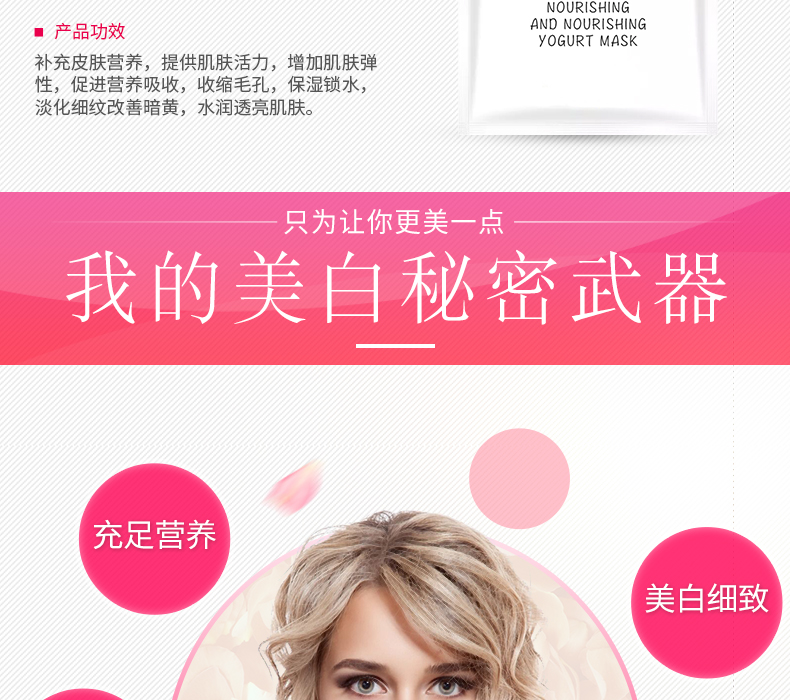 具收斂作用,長(zhǎng)期堅(jiān)持可消除面部皮膚上的皺紋,使皮膚潤(rùn)滑,適用于中老年婦女或面部皺紋較多的孕產(chǎn)婦。對(duì)皮膚調(diào)整和保健作用,酸奶活力嫩膚面膜還可使皮膚增白。