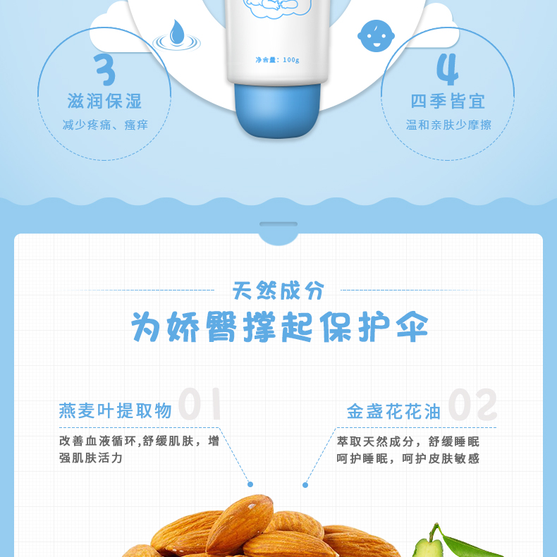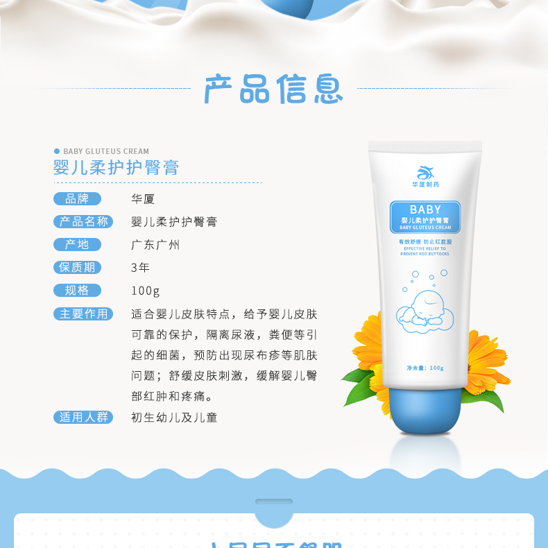 3、華廈嬰兒柔護護臀膏含特殊滋潤成份,輕柔呵護嬌嫩的皮膚,減少疼痛、瘙癢,使之柔潤光滑。