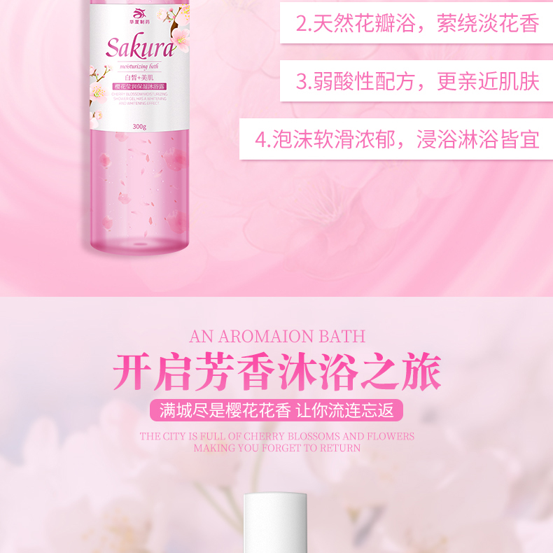 華廈櫻花瑩潤保濕沐浴露所使用原料全為天然食品級(jí),無毒安全,能有效抑制有害細(xì)菌的滋長,增長你的免疫能力。享受花瓣沐浴的香薰,增加沐浴情趣,讓你的肌膚更滋潤光滑。