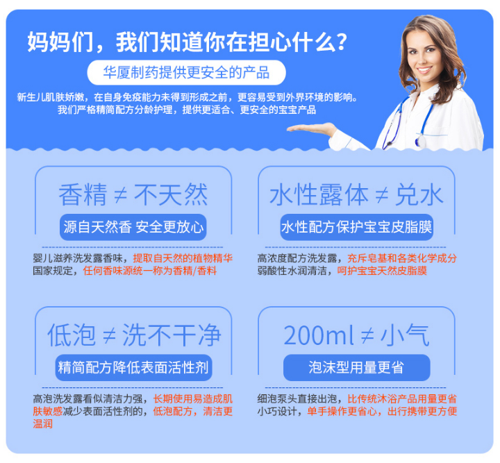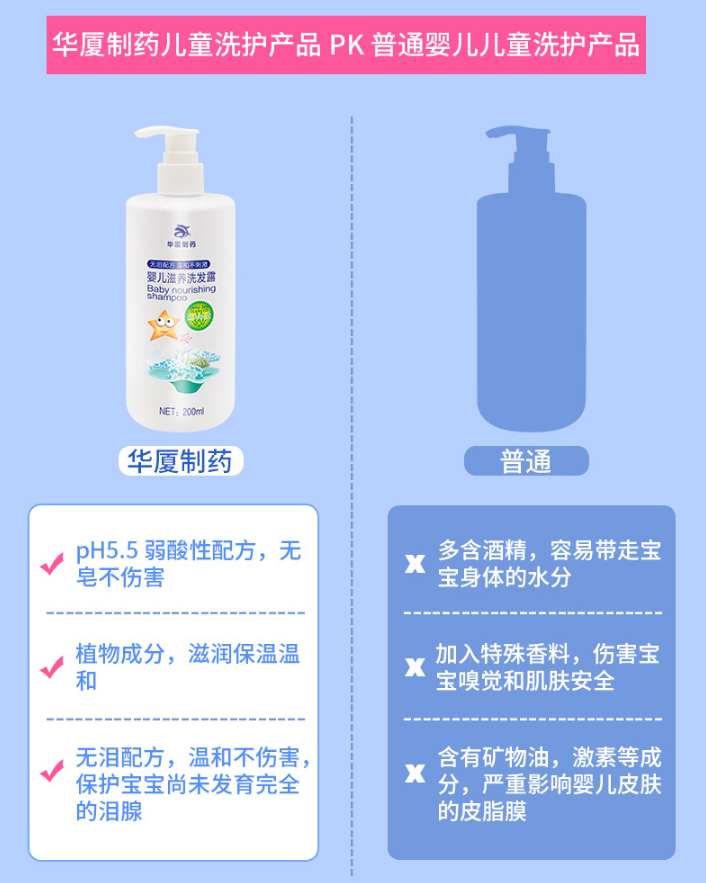 華廈嬰兒“無淚配方”洗發(fā)水主要特點是不會刺激到寶寶的眼睛和淚腺,讓寶寶不再懼怕洗澡。通常如果產(chǎn)品標示有無淚配方,對寶寶眼睛的刺激比同類其他產(chǎn)品刺激會小。