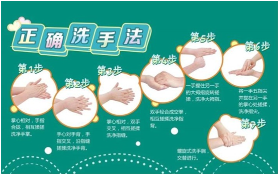 這里我們推薦七步洗手法口訣:“一搓手掌,二洗手背,三擦指縫,四扭指背,五轉(zhuǎn)大彎,六揉指尖,七洗手腕”。七步洗手法圖解(要求流動(dòng)水洗手至少30秒,且要使用洗手液)。