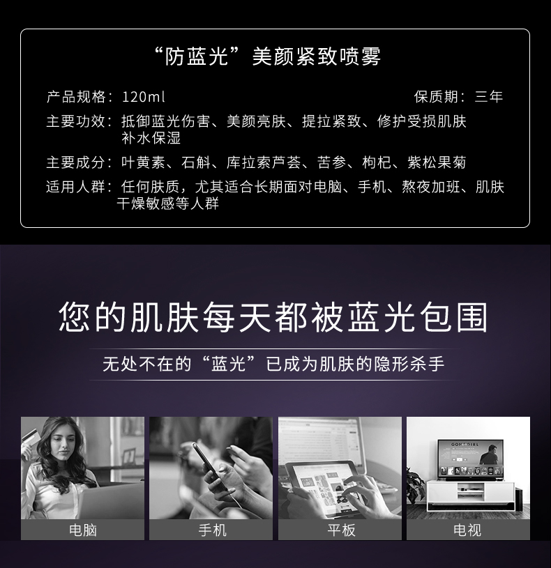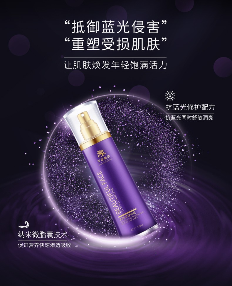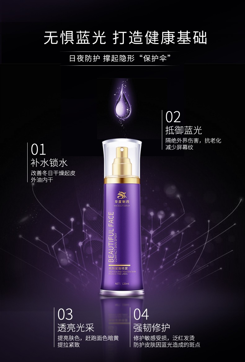 華廈防藍(lán)光緊致噴霧特含葉黃素。葉黃素被稱為藍(lán)光隔離使者,過(guò)濾生活中的藍(lán)光,強(qiáng)有力的抗氧化作用,防老化。
