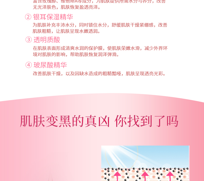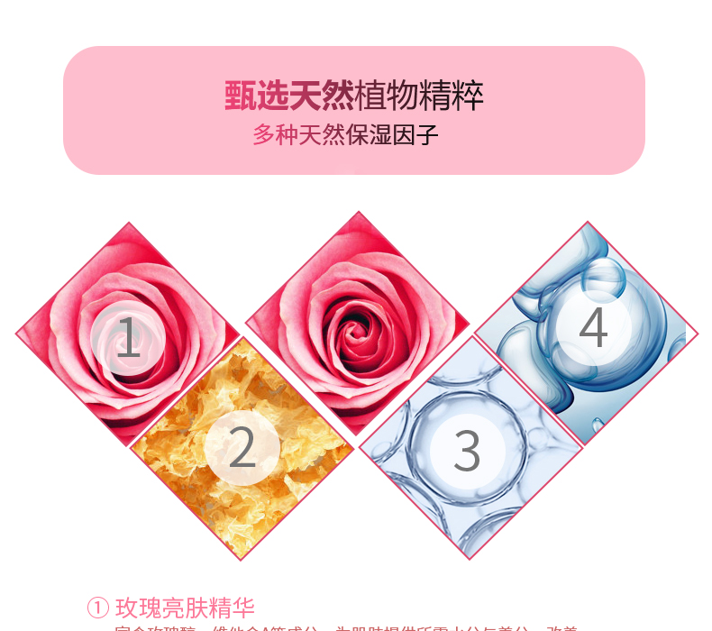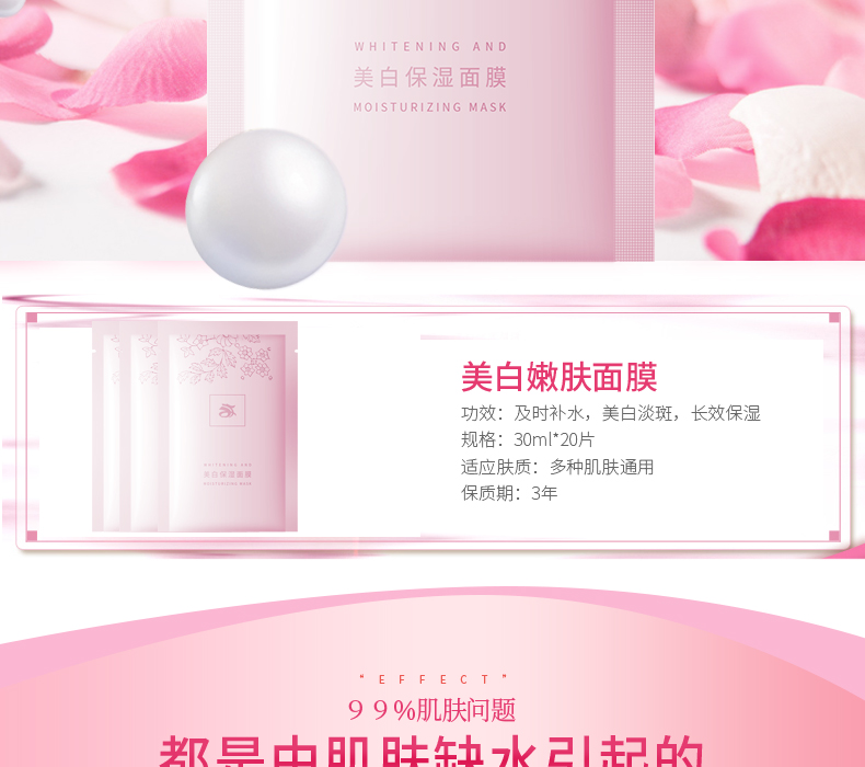 美白保濕面膜甄選天然植物精粹和多種天然保濕因子,包含玫瑰亮膚精華、銀耳保濕精華、透明質(zhì)酸、玻尿酸精華。美白保濕面膜五大功效,肌膚再生、抗氧化、補(bǔ)充營(yíng)養(yǎng)、保濕功能、恢復(fù)新生不留痕跡。