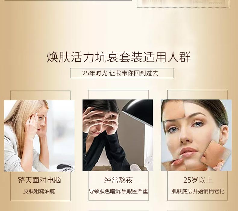 令萬千女性心儀的煥膚活力坑衰套裝,通過清除肌膚最深層的細(xì)胞分子毒素,煥膚活力坑衰套裝激活了干細(xì)胞超凡的再生能力,并重賦肌膚健康的活力與年輕的光采。全然新生的肌膚對(duì)于卓效抗老分子(維生素A,C等)的吸收更迅速,抗老功效可遠(yuǎn)高達(dá)2倍、3倍甚至4倍。煥膚活力坑衰套裝如今已成為抵御衰老不可或缺的第一步,開創(chuàng)了全新的美膚護(hù)理程序,成為一款備受推崇的“明星”產(chǎn)品。