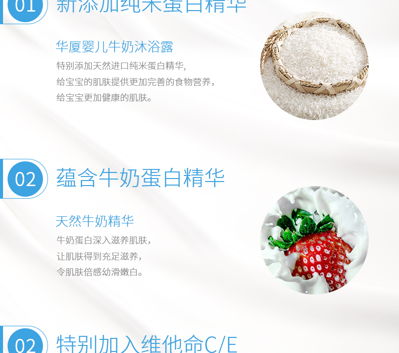 嬰兒牛奶沐浴露蘊含豐富牛奶精華和維生素C、E,給寶寶嬌嫩的頭發(fā)和肌膚提供更豐富的營養(yǎng)。嬰兒牛奶沐浴露每天使用,溫和洗凈的同時,更可滋養(yǎng)柔潤肌膚,令寶寶肌膚更健康柔滑。媽媽使用,也能擁有寶寶般柔滑嫩白的肌膚。