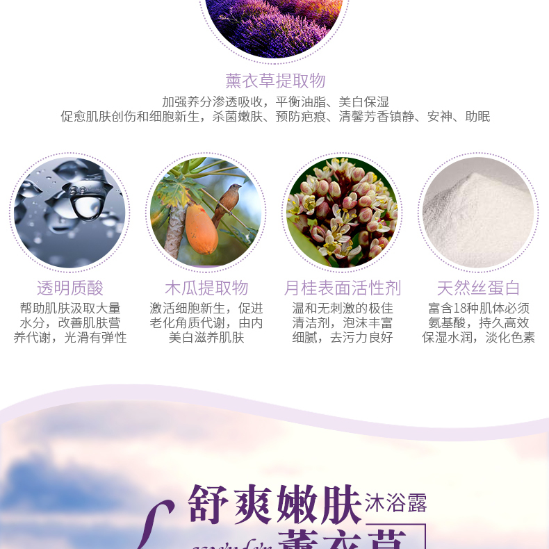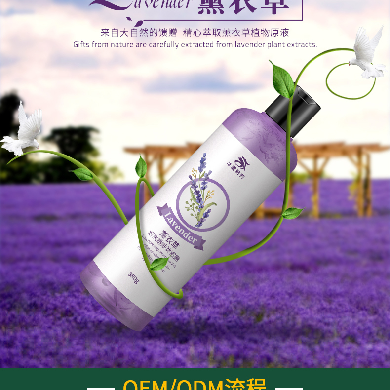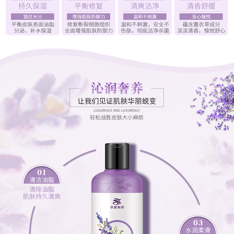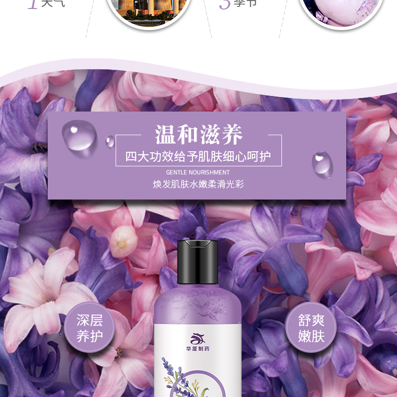 華廈薰衣草舒爽嫩膚沐浴露內(nèi)含保濕因子,如紙一樣柔軟輕盈、芳香宜人,遇水可完全溶化,PH值弱酸性,內(nèi)含花卉精油能促進(jìn)肌膚新生代謝,細(xì)致毛孔,對(duì)于肌膚干燥有高度的滋潤(rùn)效果,能平衡身體水油,能迅速有效地深入肌膚,促使全身血液循環(huán),刺激大腦,消除疲勞。