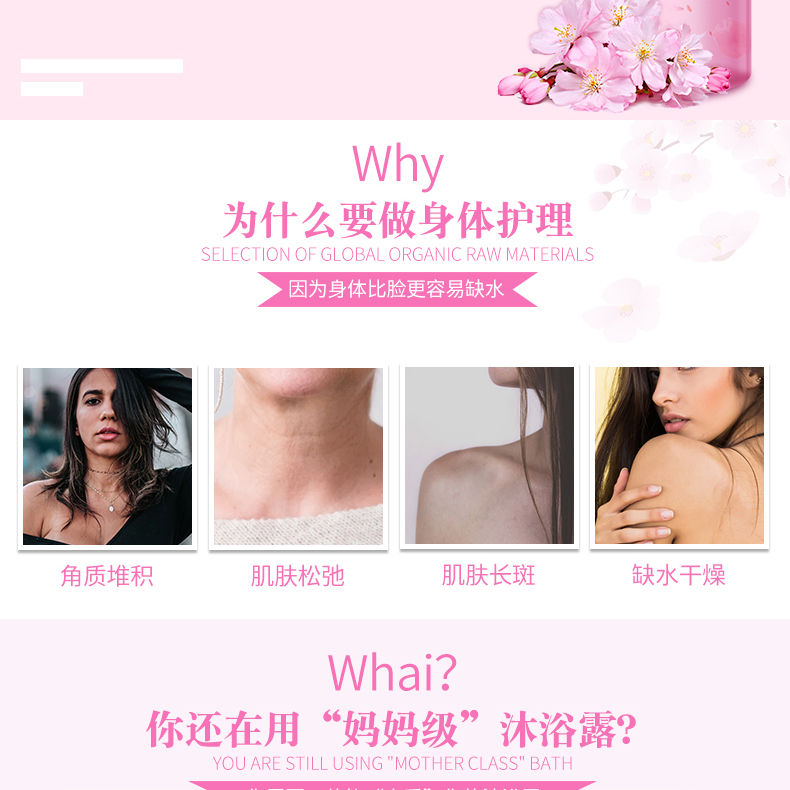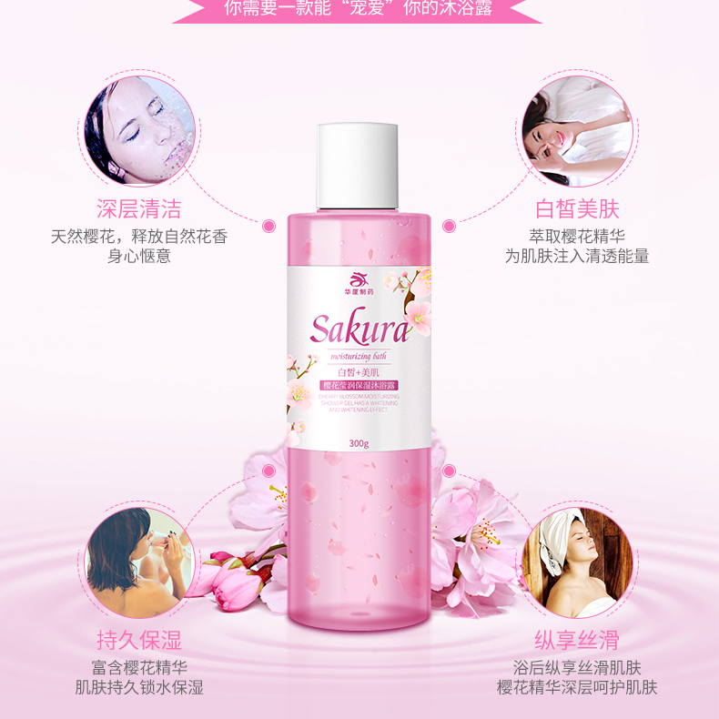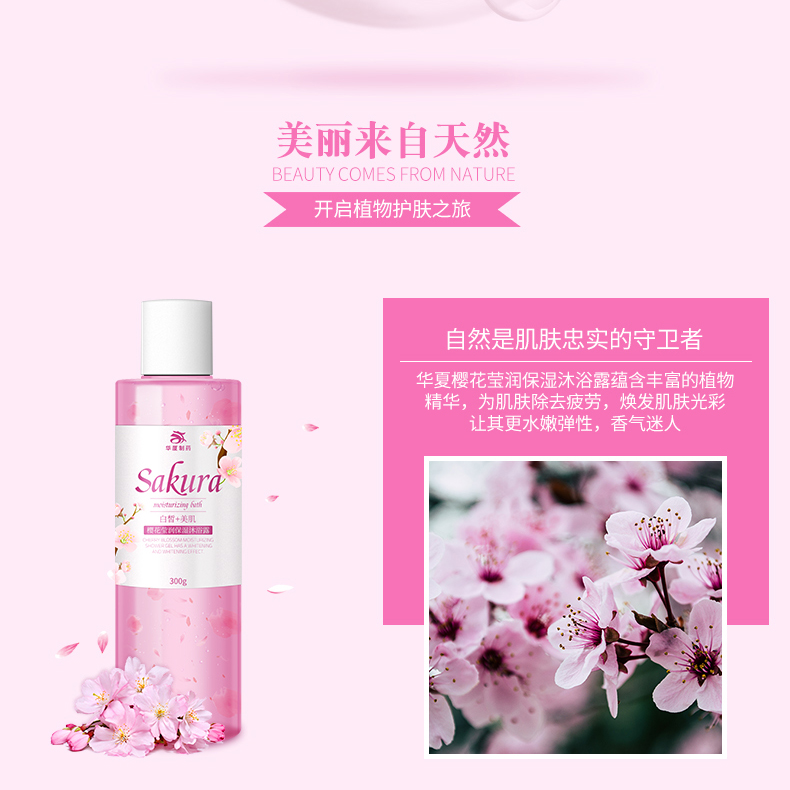 華廈櫻花瑩潤保濕沐浴露所使用原料全為天然食品級,無毒安全,能有效抑制有害細菌的滋長,增長你的免疫能力。享受花瓣沐浴的香薰,增加沐浴情趣,讓你的肌膚更滋潤光滑。